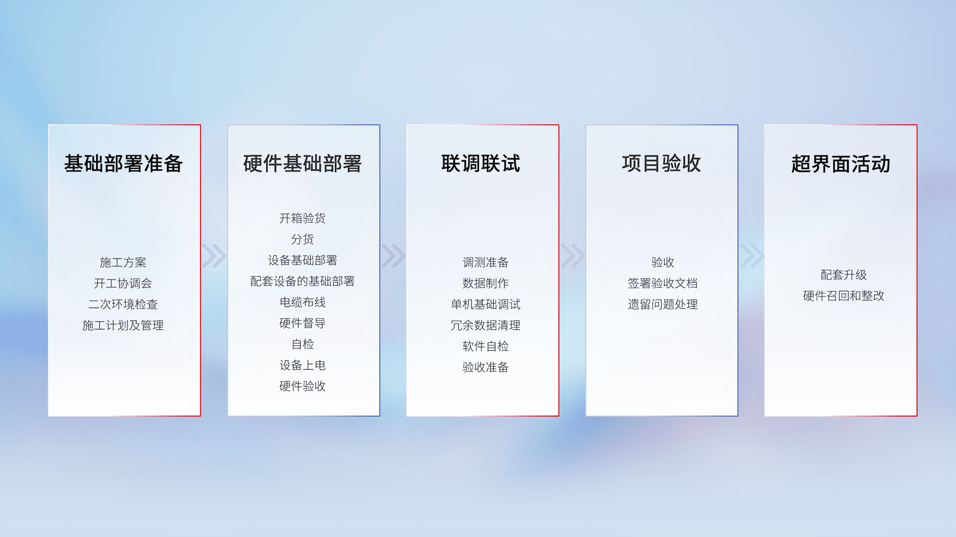 从基础部署准备、、硬件基础部署、、、联调联试、、、项目验收、、、越界面活动的全过程可追溯,,,,保证施工质量和进度。。。。